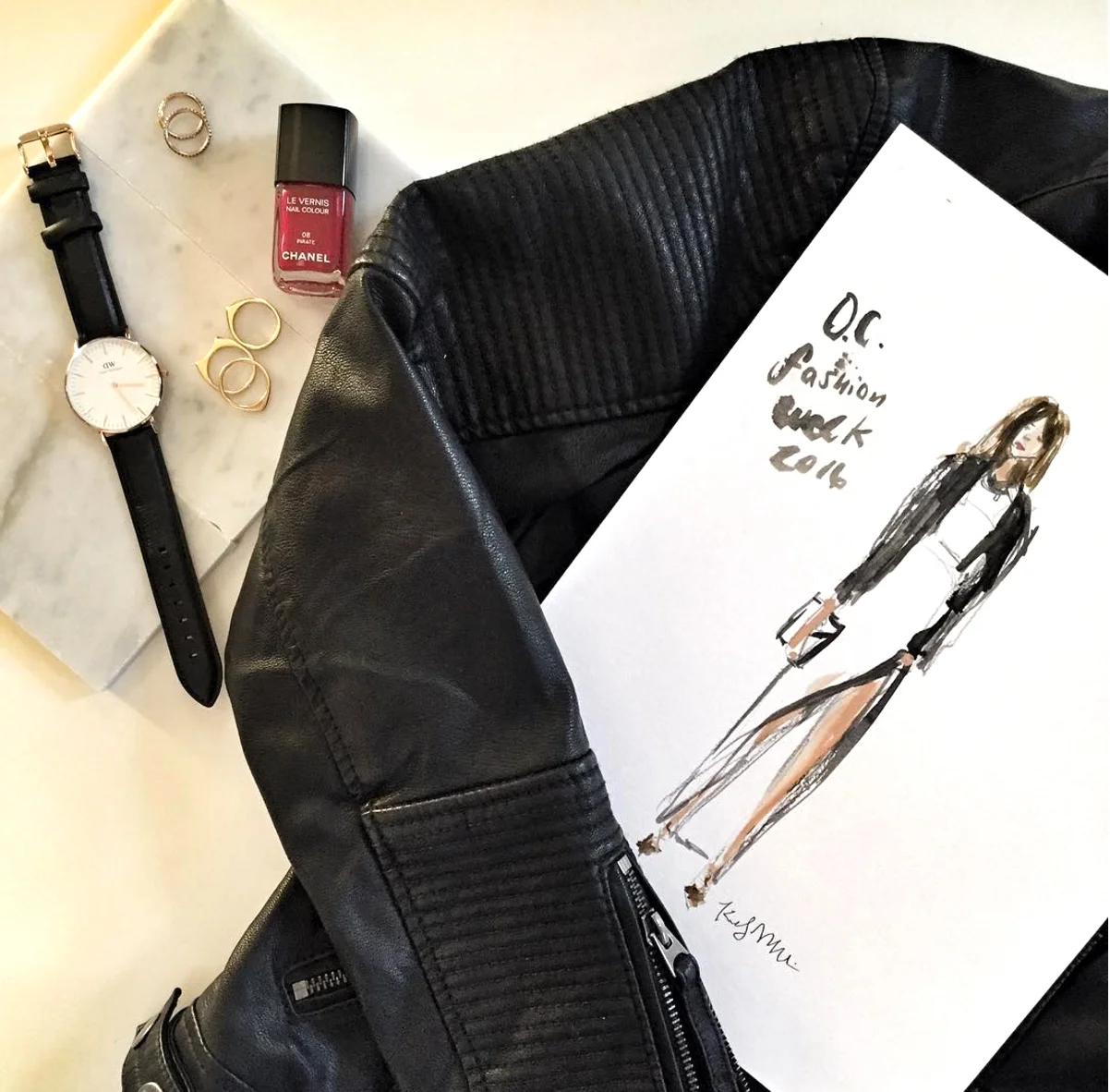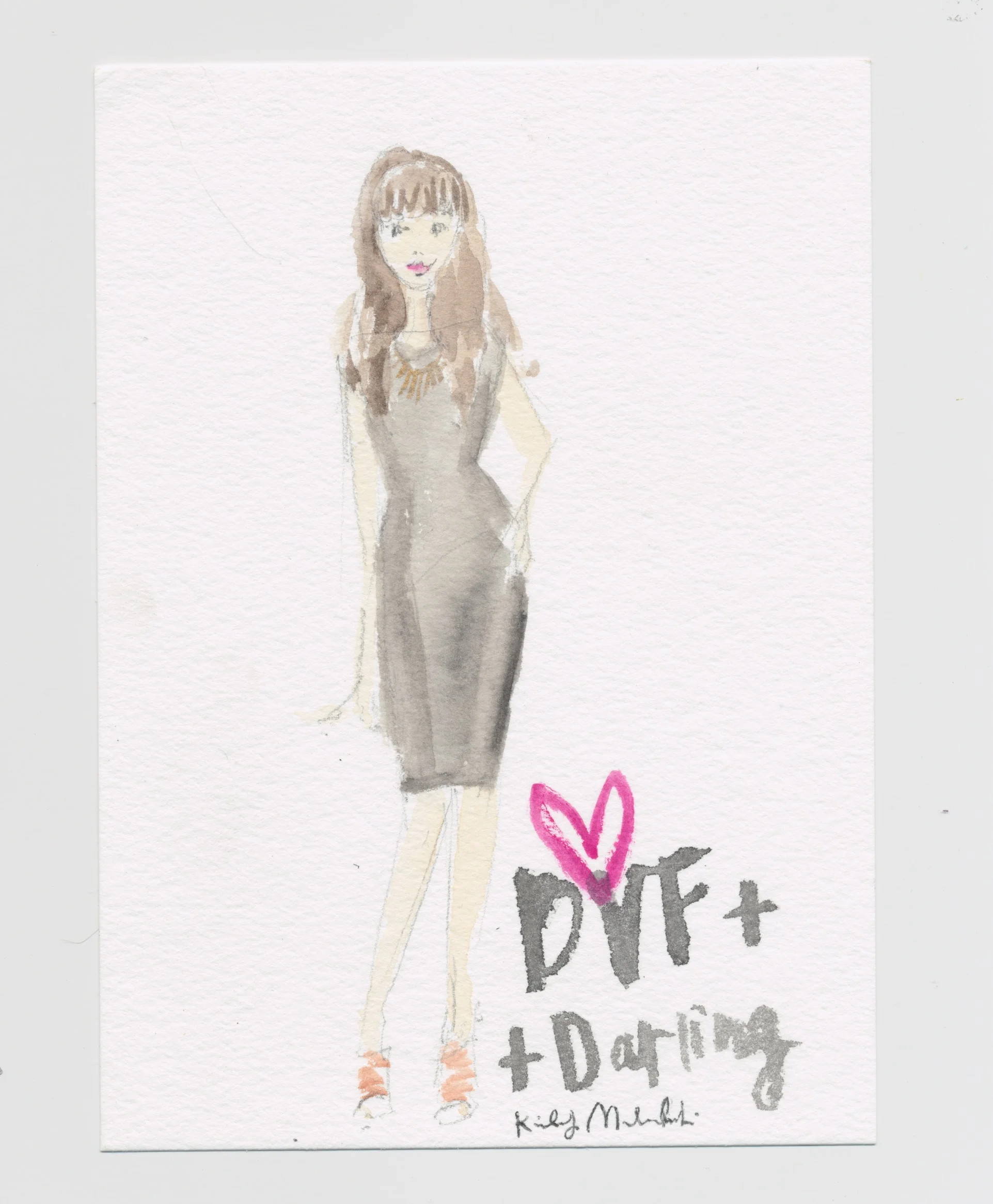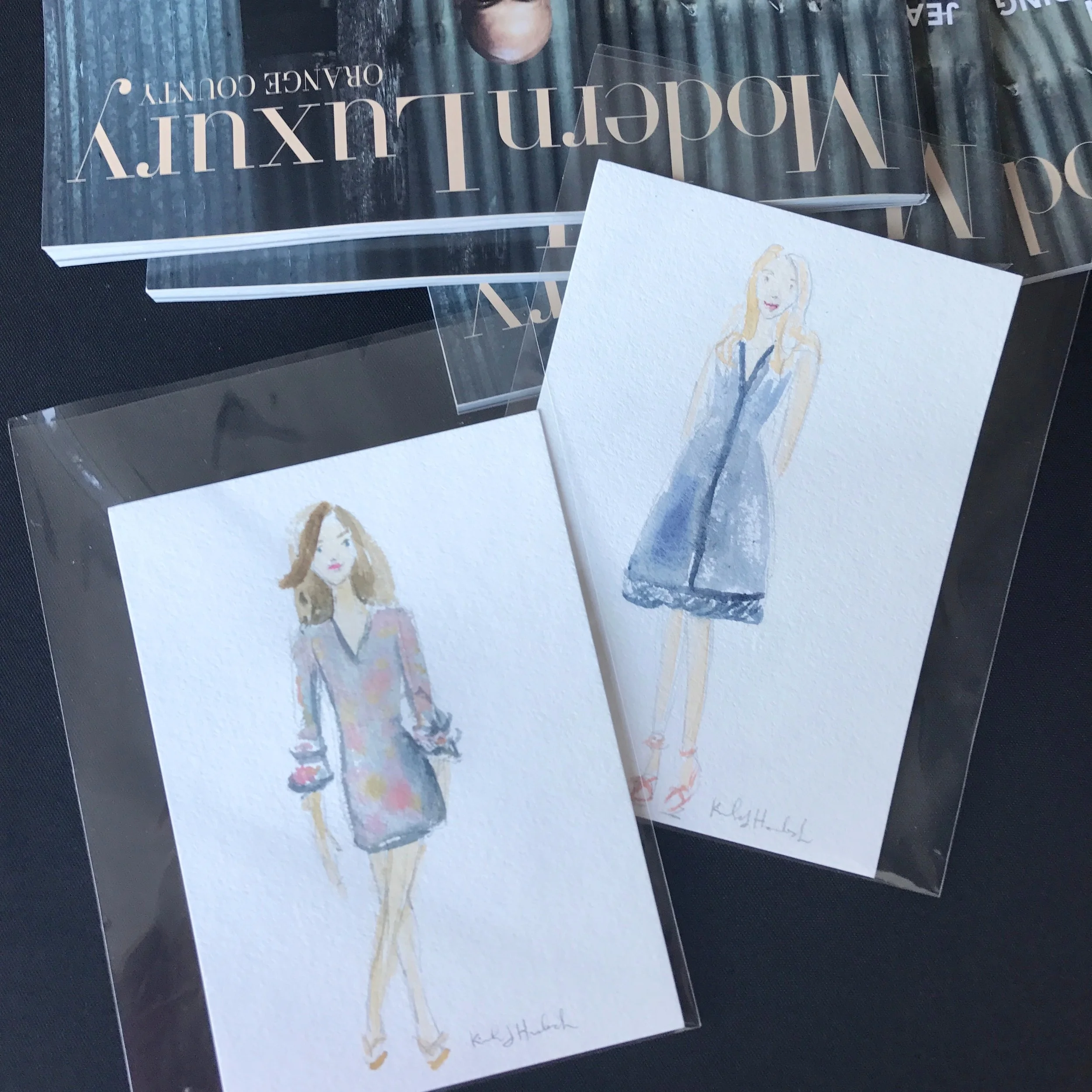 Seen here an original commissioned watercolor fashion illustration for the Bloomingdales Outlet printed on cards and live hand-lettered with watercolor for guests at the Yelp OC Elite event held at the Outlets at Orange.