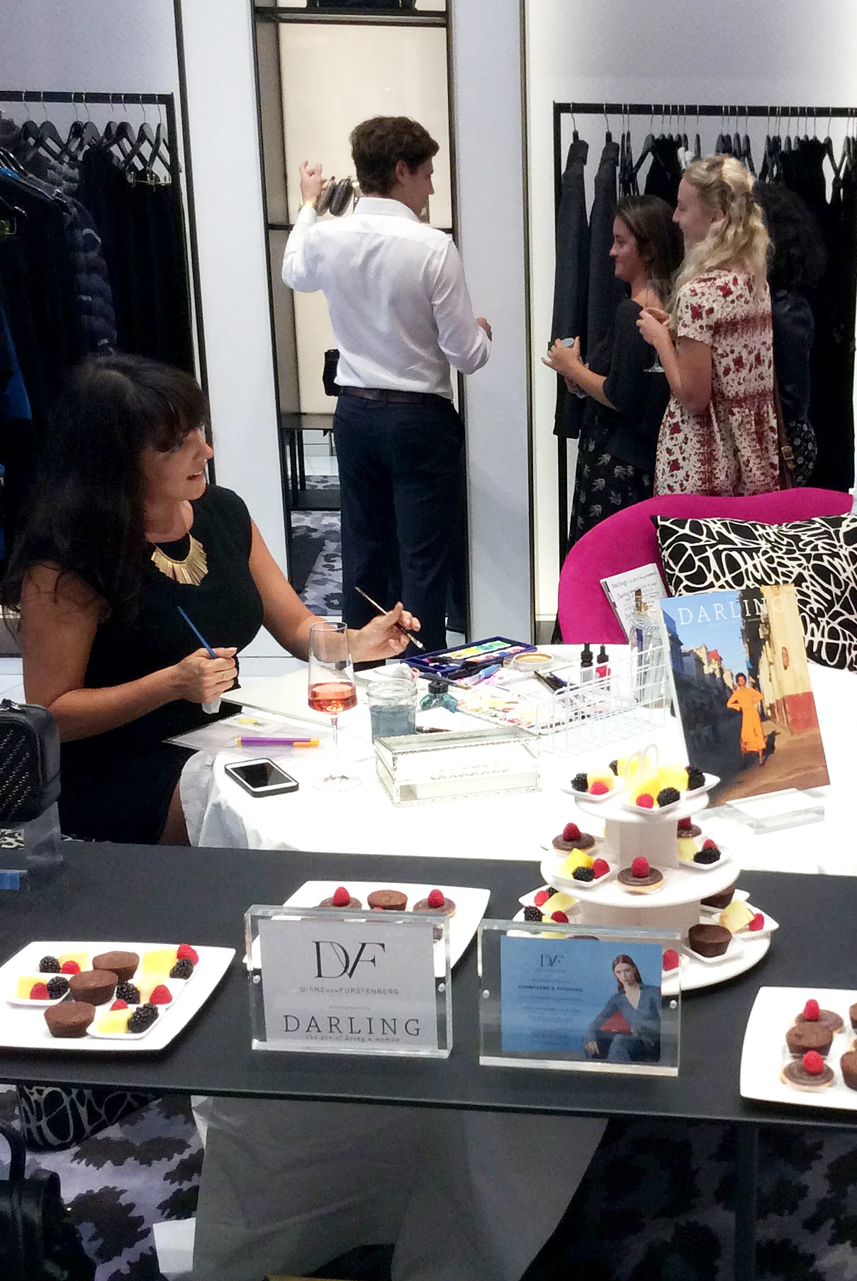 Live watercolor fashion illustrating guest at the Darling magazine and DVF Santa Monica store event at Third Street Promenade.